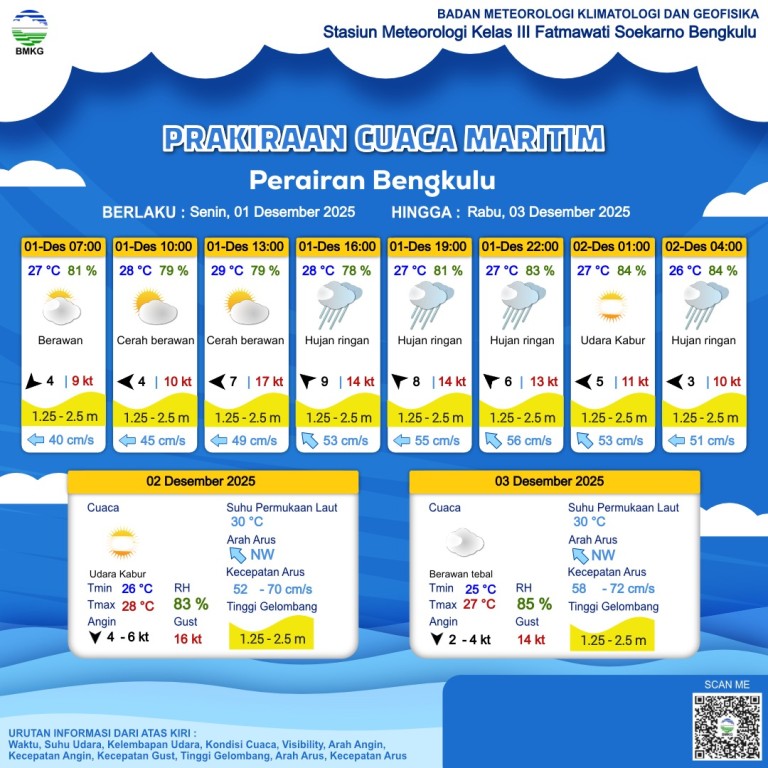 Berikut prakiraan cuaca hari Senin, 01 Desember 2025.